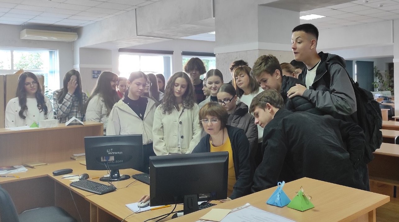 Гостей зустрічала заступниця директора Наукової бібліотеки Воробець Вікторія Вікторівна, яка ознайомила присутніх з історією та сьогоденням книгозбірні. Вона розповіла про сучасні методи обслуговування користувачів, що активно впроваджуються завдяки розвитку технологій, а також наголосила на важливості традиційних бібліотечних форм роботи, які залишаються невід’ємною частиною освітнього процесу.